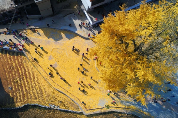 一片片金黄的银杏叶随风飘落,像金子般铺满了村前的广场。