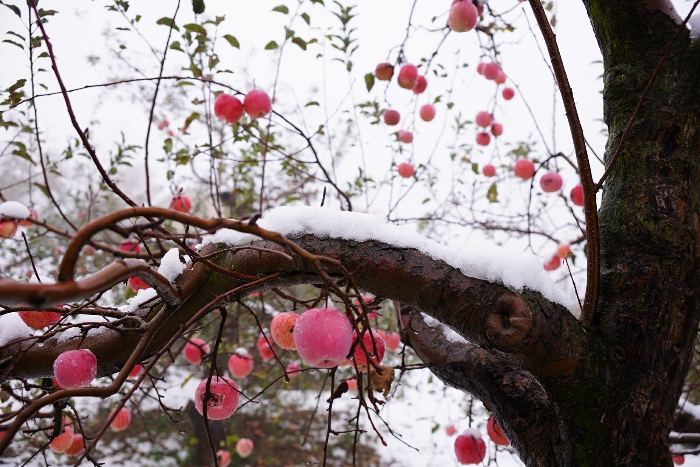 小雪时节,气温骤降,突如其来的雪花飘落在豫西丘陵一带的苹果园里,颗颗红果映白雪,分外美丽妖娆。