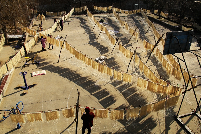 金粉如瀑,阳光如注。入冬时节,中原勤劳的农家人用传统的手工艺,将红薯粉条在场院排排挂起进行晾晒,待水分完全脱干后,干粉条就成了一道全年可储藏、简单易食用的人间美味,蕴含着浓浓的乡情。