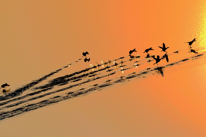 夕阳西下,野鸭如水中精灵,在平静的湖面上时而翩翩起舞,时而交颈嬉戏,激起道道涟漪,为寒冷萧瑟的冬季凭添几分意趣。