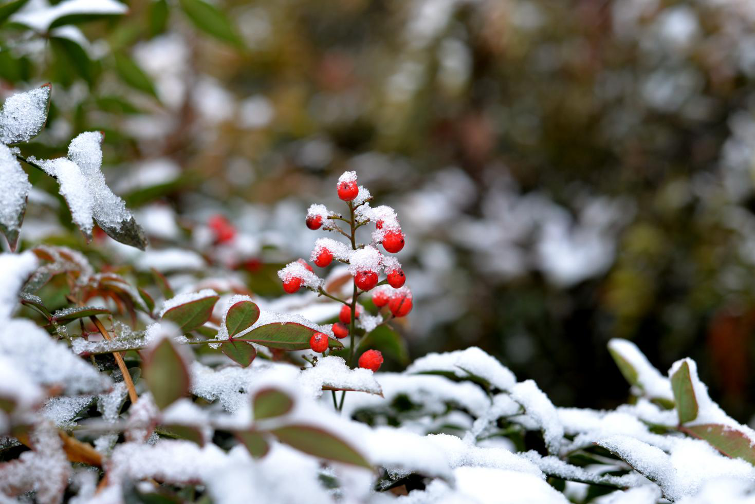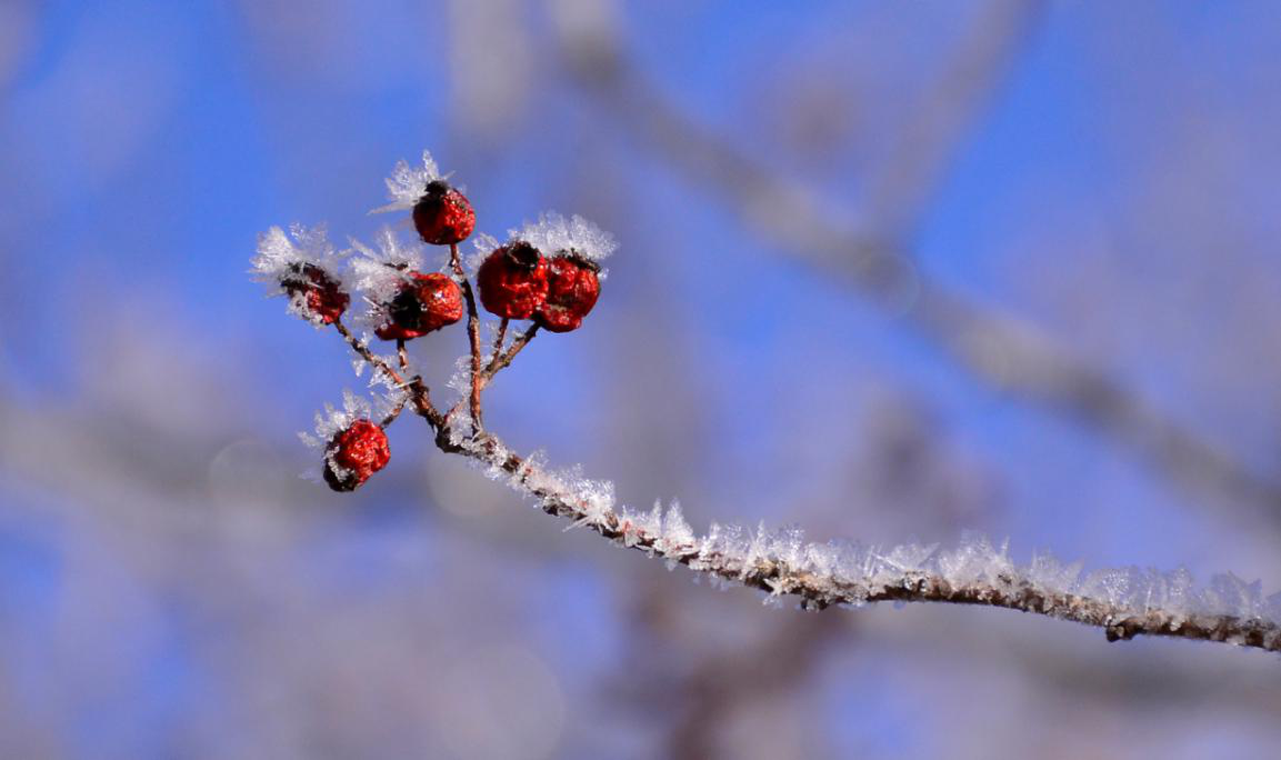 小雪时节,在应时而来的冷空气作用下,树梢上凝结了晶莹剔透的冰晶。乳白的冰晶、鲜红的果实,呈现出一幅娇艳欲滴的美丽图景,让人不禁感叹大自然神奇的画笔。