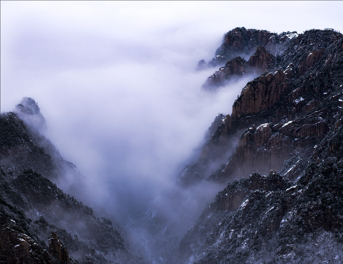 “渺万里层云,千山暮雪,只影向谁去”。小雪时节,太行山沟壑内云雾缭绕 ,白雪飘落点缀其中,一层层山一道道岭昂首翘足,时令的转换,让挺拔险峻的山脉多姿多彩。