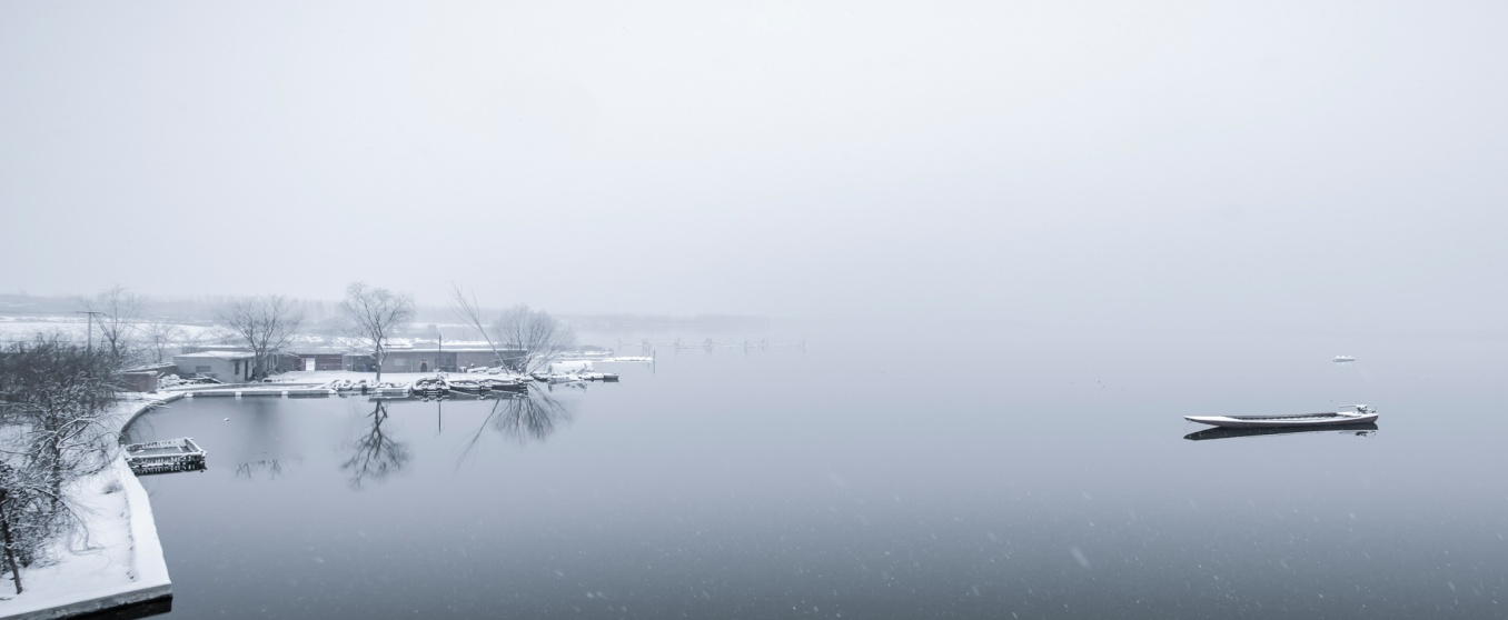 薄雪轻施,寒江静横,枯树萧森,闲泛孤舟,一切都在幽冷中透出宁静,让人心如冰壶,归于这清晖浮动的美景之中。