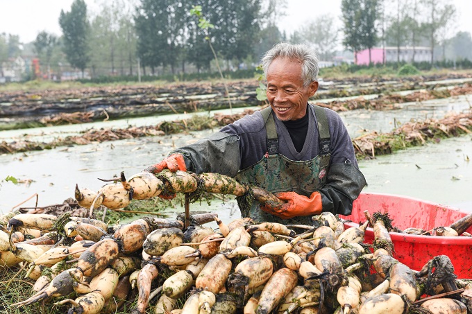 金秋时节,莲藕田的水泽间,农户正在采摘莲藕,沾满泥渍的莲藕透着新鲜劲,他的笑容里满是秋日劳作后丰收的欣慰与踏实。(商水县纪委监委 雷海涛 摄)