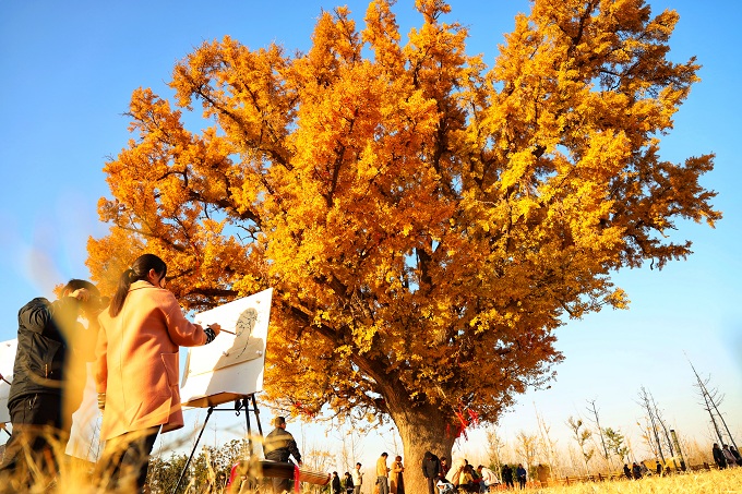 满树金黄银杏叶,翩然飘落,秋日的美景尽收眼底,画家用画笔定格叶的温柔与金秋十月的晴朗。图为鹿邑县千年银杏树下游人赏秋的美好场景。(鹿邑县纪委监委 郭磊 摄)