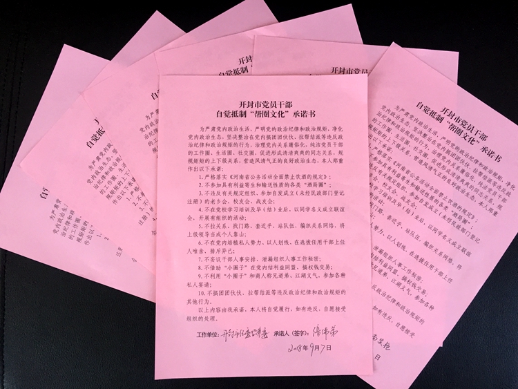 “严格落实《河南省公务活动全面禁止饮酒的规定》,不参加具有利益寄生和输送性质的各类‘酒局圈’……”按照开封开展整治“帮圈文化”专项排查工作要求,9月7日,全市党员干部就做好抵制“帮圈文化”作出以上承诺。