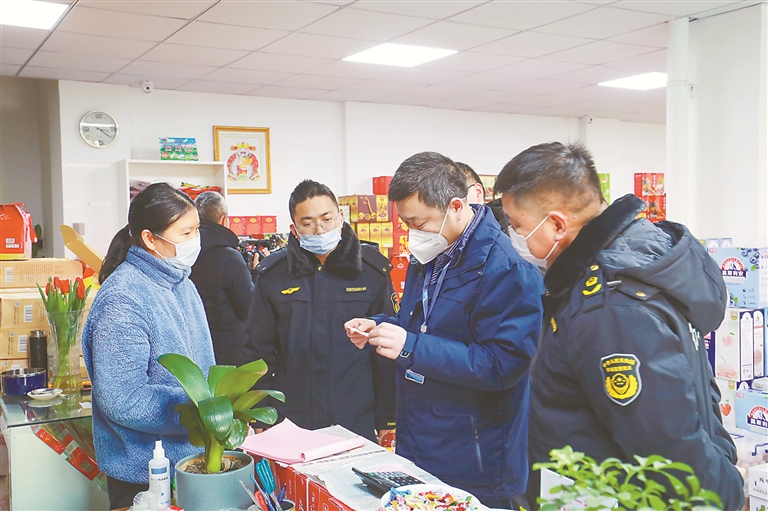 江苏省东海县纪委监委联合市场监管等部门紧盯节日期间食品安全开展专项监督检查,保障人民群众度过安定祥和的节日。图为近日,该县督查人员在商超开展监督检查。姜辉 摄