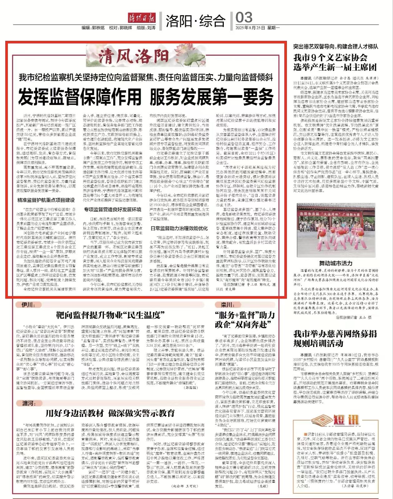 涧西区纪委监委紧盯重点片区提升改造项目建设,建立责任划分、当场反馈、跟踪督导、整改落实闭环机制,推动主责单位高效履职;汝阳县纪委监委紧盯矿山等安全生产问题易发多发领域开展专项监督检查,对发现的问题现场交办、督促职能部门跟进整改……