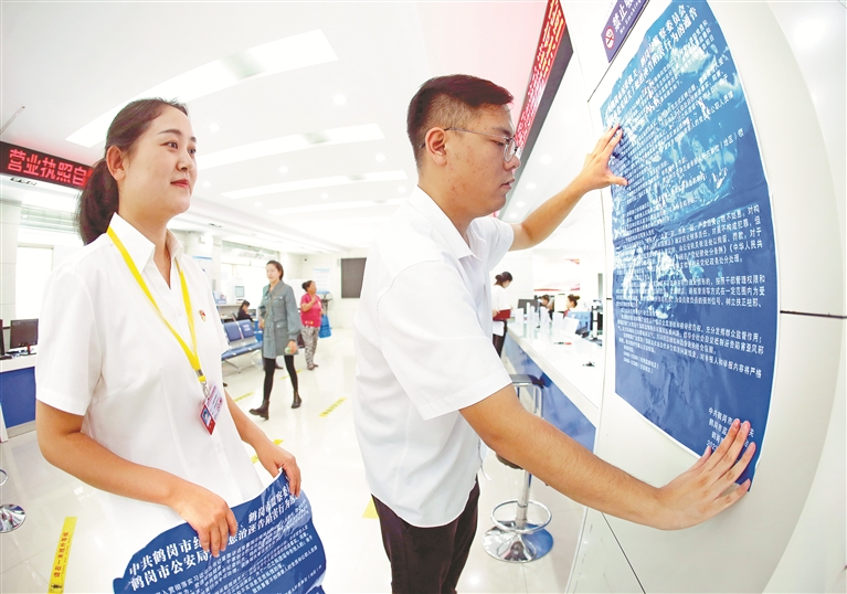 黑龙江省鹤岗市纪检监察机关工作人员在政务服务大厅张贴“关于惩治诬告陷害行为的通告”宣传海报,并向办事群众发放宣传单,讲解专项治理工作内容。柏常海 摄