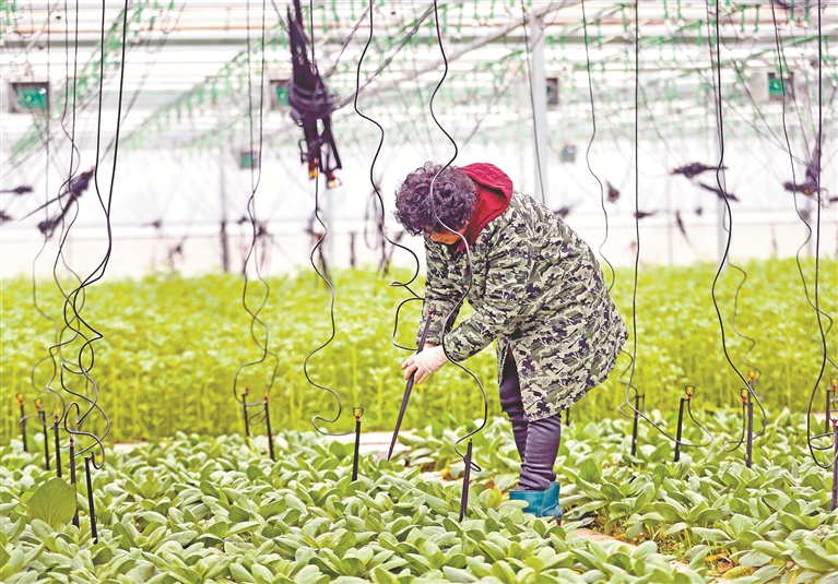 图②:浙江省湖州市“壹伍田园”大棚内,工人正在调试设备。该大棚利用物联网技术实现远程控制,让用户可以在任何时间、任何地点完成浇水、施肥、视频监控等操作。图片来源:视觉中国
