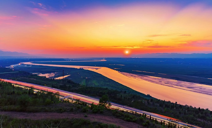 夕阳西下,黄河灵宝段西寨村头,漫天的霞光染红了天空,大河缓缓地流淌,河面镀着层淡淡的金色,岸上的高速公路也幻化成彩虹路,母亲河是如此的瑰丽壮观!(灵宝市纪委监委 许晓珂 摄)
