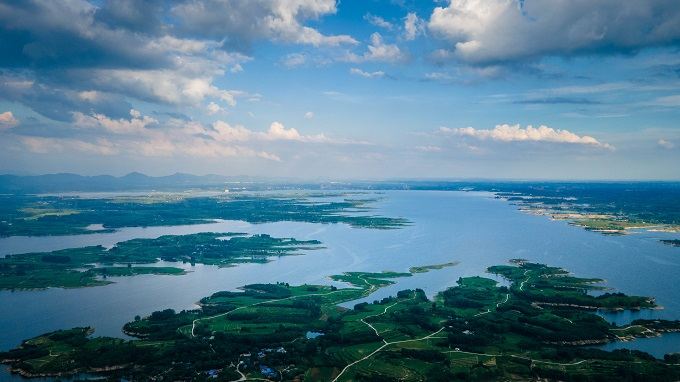 湖泊如镜,揽住云朵与青山;绿野似毯,铺满生机与希望。(南召县纪委监委 周闻天 摄)