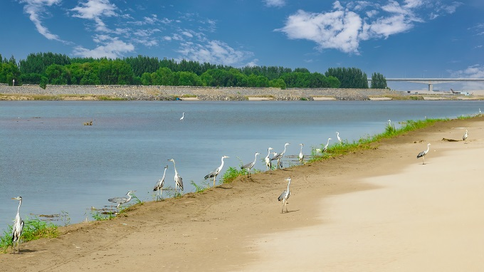 黄河岸边,河水清澈,灰鹭或立滩涂、或游水面,岸边绿树成荫,桥跨天际,尽显黄河生态治理后的生机与美丽。(原阳县纪委监委 尹恒 摄)