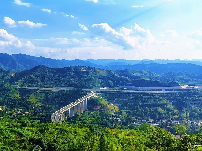 晴空如洗,白云漫卷,阳光倾洒穹苍,远处的峰峦已晕染清透蓝调,似为天际铺展绒毯。葱郁的群山像翠浪涌动大地,层峦之间,一条长龙般的桥梁横跨山谷,高桥巍峨,在辽阔风光里,尽显雄浑壮阔,让山河更具气象。(卢氏县纪委监委 李鸣 摄)