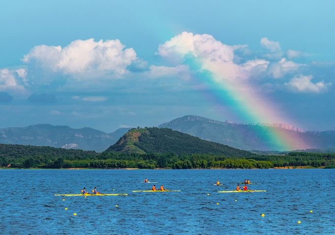 赛艇逐浪,彩虹卧空,青山如黛衬碧水,艇影搅碎一湖晴光,与天地共绘活力长卷。(舞钢市纪委监委 孙风霞 摄)