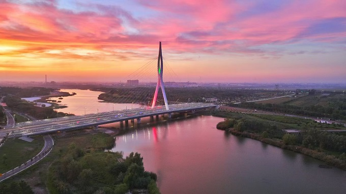 鎏金与绛紫肆意交融翻滚的朝霞,将苍穹渲染成一块瑰丽的幕布。在这片璀璨的天光之下,大沙河上那座“双手合十”的桥,仿佛一位虔诚的守望者,静对东方。这不仅是桥梁与河流的对话,更是自然之壮美与人文之静穆在晨晖中最动人的共鸣。(焦作市解放区纪委监委 王利江 摄)
