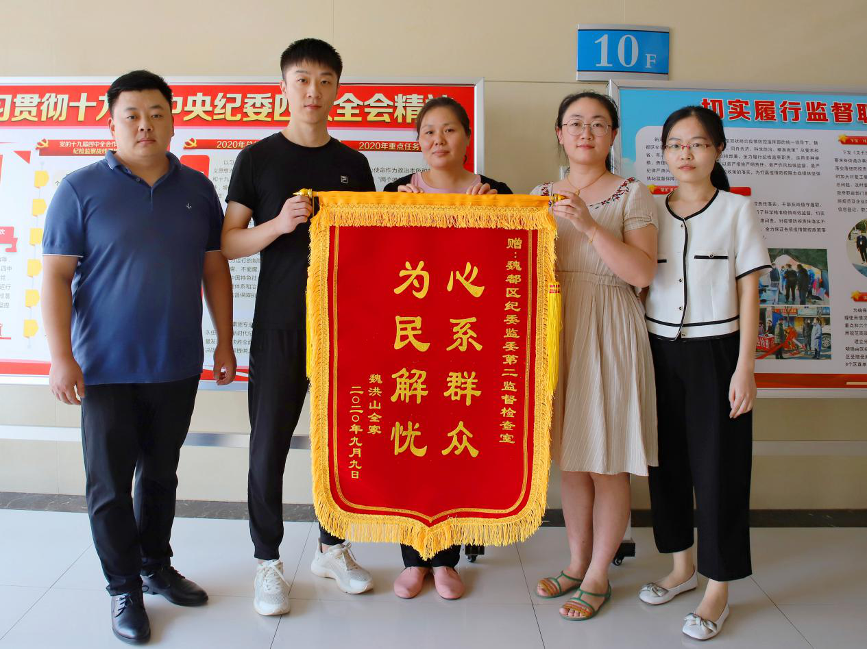 “感谢纪委的同志为民办事、为民排忧,谢谢你们耐心地为我们解决问题,我的孩子才能安心入学……”9月14日上午,魏都区新兴街道办事处裴山庙社区居民魏某满怀感激的心情将一面写有“为民解忧,心系群众”的锦旗送到了魏都区纪委监委第二监督检查室工作人员的手中,对纪委同志依规依纪履职为群众解决实际问题表示感谢。