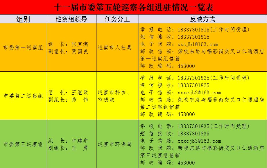 本轮巡察从3月20日开始,到5月18日结束。巡察期间,市委各巡察组均开通联系电话、接收短信手机、电子邮箱、邮政信箱,并在被巡察单位显著位置设立征求意见箱,接收关于被巡察单位党组织领导班子及其成员、下一级党组织领导班子主要负责人和重要岗位领导干部的反映,重点是关于违反政治纪律、组织纪律、廉政纪律、群众纪律、工作纪律和生活纪律等方面的举报和反映,受理时间为工作时间。巡察结束后,上述反映问题方式自动关闭。对与巡察工作无直接关系的个人诉求、涉法涉诉等信访问题,将按规定转交被巡察单位和有关地方、部门处理。
